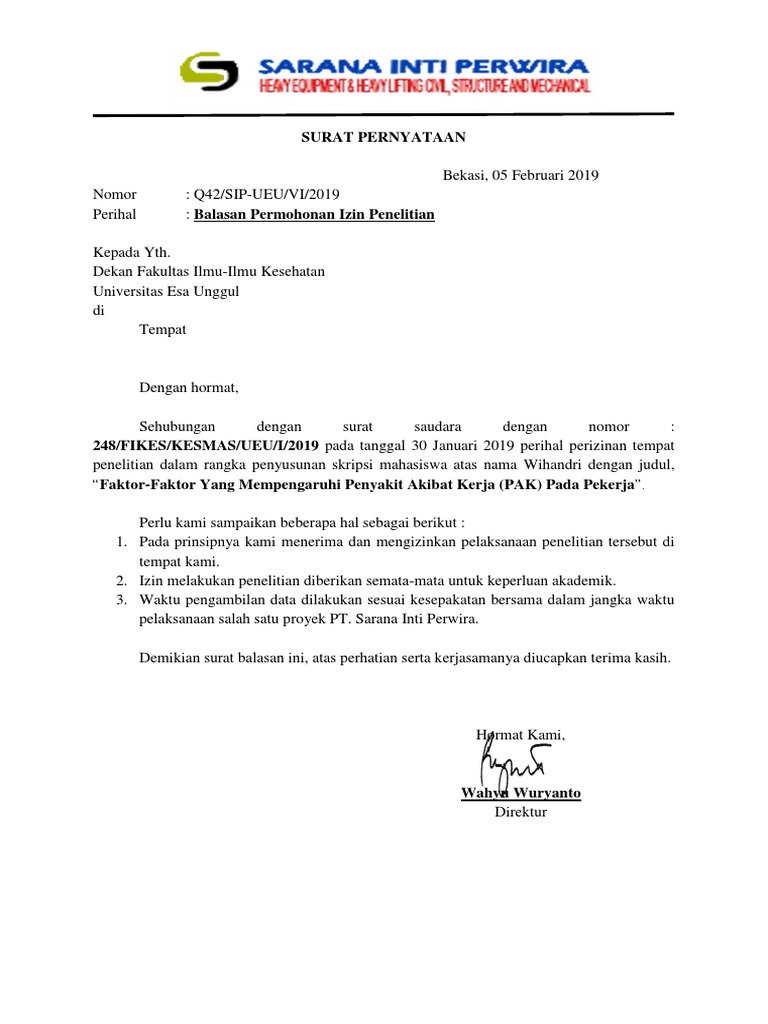 Demikian surat balasan permohonan izin penelitian dari kami. Setelah kami pelajari kualifikasi saudara secara keseluruhan, kami yakin bahwa saudara sangat tepat untuk berbagai posisi di manajemen kami. Informasi lebih lanjut bisa menghubungi bapak nawan (087656748949). Nah itulah contoh kuesioner yang baik dan benar. Contoh surat akuan bujang contoh surat akuan bujang dari majikan contoh surat akuan bujang dari pesuruhjaya sumpah contoh surat akuan bujang ketua kakak osis contoh membuat surat izin tidak masuk sekolah karena sakit contoh membuat surat lamaran kerja yang benar contoh penulisan. Kepala sekolah dasar negeri 01 sidomujur. Pada dasarnya surat balasan penawaran merupakan sebuah surat yang dibuat untuk menginformasikan bahwa perusahaan yang bersangkutan telah setuju untuk menerima tawaran produk dari perusahaan yang sebelumnya telah menawarkan produk mereka. Doc contoh surat pindah tugas kaharuddin hanun academia edu. 9 contoh kuesioner skripsi penelitian kinerja karyawan kepuasan. Contoh surat permohonan penelitian skripsi yang baik dan benar. Demikian surat balasan dari kami. Contoh surat balasan penelitian skripsi doc suratmenyurat net. Setiap mahasiswa di perguruan tinggi diwajibkan untuk melakukan penelitian akhir untuk menghasilkan karya tulis ilmiah berupa skripsi, tesis atau disertasi, dimana kti tersebut berasal dari kegiatan penelitian yang dilakukan baik.